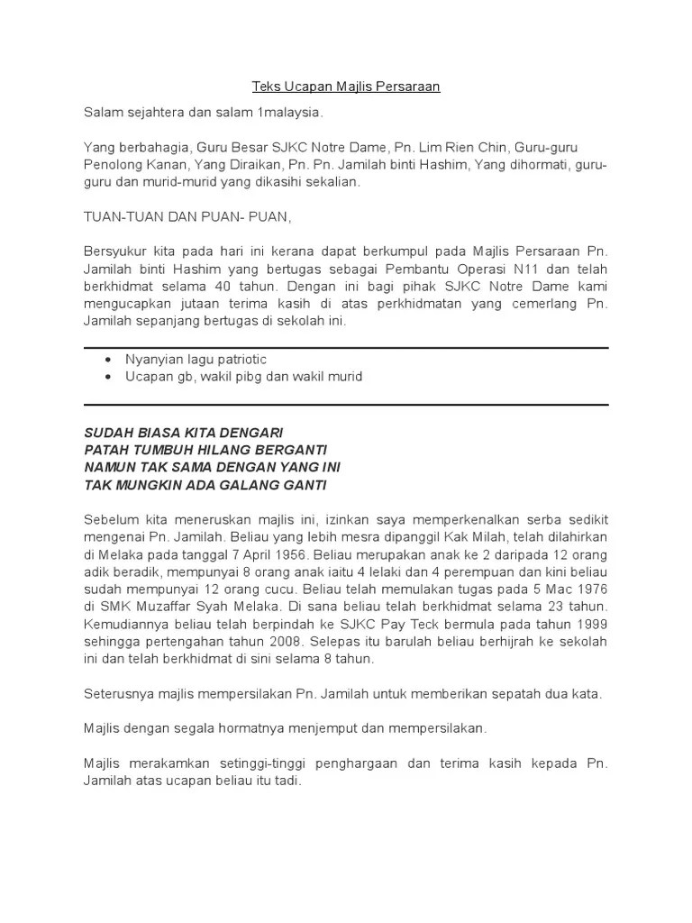 Contoh teks pengacara majlis / ucapan emcee majlis persaraan cikgu. Teks ucapan majlis perpisahan persaraan yang berusaha dan dihormati 1. Teks ucapan bagi guru yang bersara di majlis persaraan sendiri by. Terima kasih atas penghormatan ini untuk saya berucap sepatah dua kata dalam majlis meraikan persaraan. Saya doakan agar usaha ybhg. Saya berharap guru pengganti saya boleh melakukan sesuatu yang luar biasa untuk mencapai impian yang masih tergantung itu.