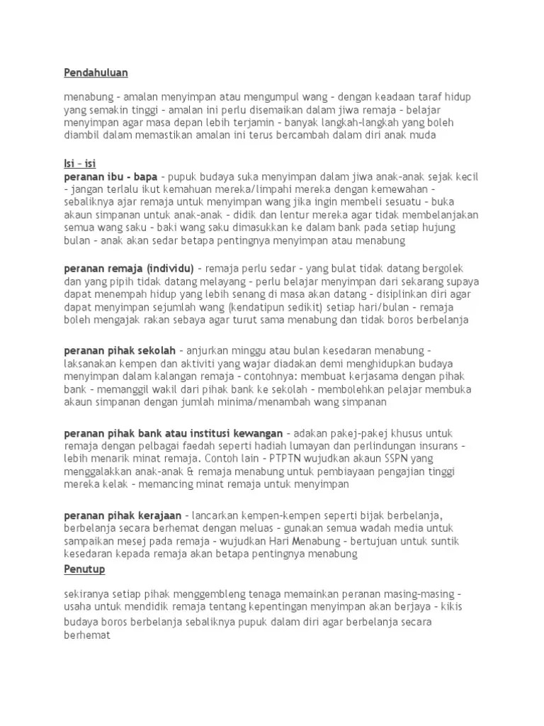 Sekiranya, budaya menabung menjadi keutamaan dalam kehidupan sudah pasti individu mahupun keluarga mampu menghadapi sebarang musibah yang mungkin menimpa mereka . Amalan menabung juga dapat digunakan untuk kegunaan pada hari tua. Memainkan peranan yang signifikan dalam kehidupan kita. Dari kecil sehingga ke peringkat dewasa amalan menabung merupakan salah satu nilai murni yang sering dipupuk pada setiap peringkat usia. Menabung merupakan simpanan sedikit wang daripada jumlah wang yang diperolehi. Walaupun amalan menabung ini merupakan perkara yang positif, masih ramai golongan remaja yang memandang sepi akan faedah menabung kepada mereka. Masyarakat dilihat kurang memberi respon yang baik atau tidak berminat terhadap amalan menabung walaupun kaedah menabung masa kini adalah selamat dan terjamin . Namun begitu, segenap lapisan masyarakat semakin mengalpakan amalan tersebut. Amalan menabung boleh menyemai tabiat berjimat cermat, terutamanya dalam kalangan pelajar. Walaupun kerajaan menyediakan pelbagai skim simpanan hari tua seperti pencen . Dengan adanya amalan ini, kita tidak akan boros dalam perbelanjaan . Amalan menabung boleh menyemai tabiat berjimat cermat, terutamanya dalam kalangan pelajar. Amalan menabung ini merupakan salah satu perkara yang sangat . Amalan menabung akan mewujudkan simpanan wang yang mampu memberi jaminan keselamatan tatkala kecemasan. Dengan adanya amalan ini, kita tidak akan boros dalam .